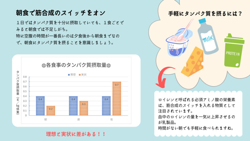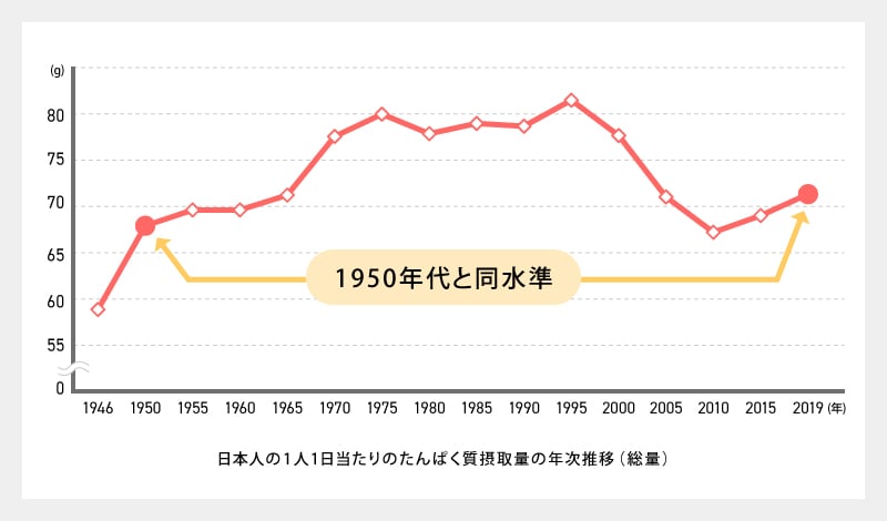 @jin_superb8L健康意識が高い人でも"約8割"は『たんぱく質』不足になっている。 ダイエットブームもあって戦後と同じレベルの摂取量まで低下している。デスクワークが中心の男性30〜49歳でも目標摂取量は【88〜135g】。実際の平均摂取量は【75g】。 食べているつもりでも、じつは足りていない。摂り方のコツは…