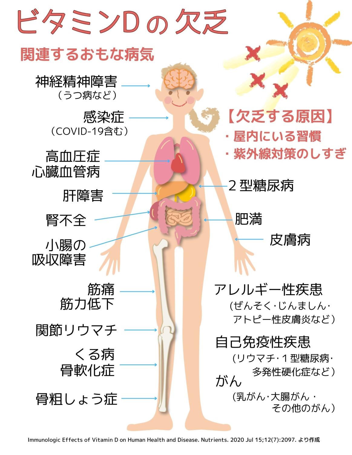 @speedking009日本人ほぼ全員ビタミンD不足 『「98%がビタミンD不足に該当していた」ことを明らかにしました。ビタミンDは骨粗しょう症を始めとして感染症や心血管疾患や神経筋疾患、自己免疫疾患発症にも関連すると言われており、新型コロナ感染症の重症化因子としても注目される重要な栄養素です』