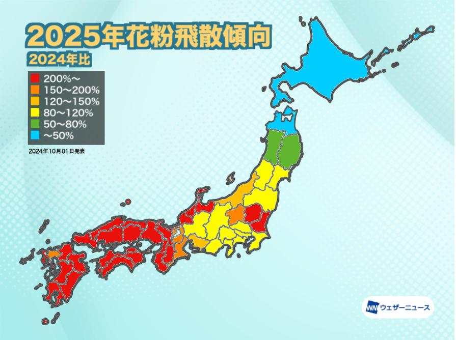 | 来年春は花粉大量飛散のおそれ 過去10年で最多か 今年夏の記録的猛暑が影響 …■2025年の春は花粉飛散の当たり年! 気象会社「ウェザーニュース」の予想によりますと、来年2025年春の花粉飛散量は、西日本や東日本のほとんどの地… (出典:RKB毎日放送) |